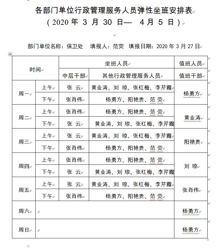 保卫处3月30日-4月5日坐班安排表