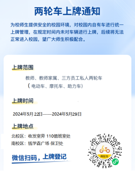 为进一步加强校园秩序和交通安全管理,解决占用、堵塞消防通道以及乱停乱放等突出问题,为师生营造良好的教学、工作和生活环境,结合我校实际情况,现对校内教职工电动单(摩托)车进行实名登记上牌管理。现将相关事项通知如下:
