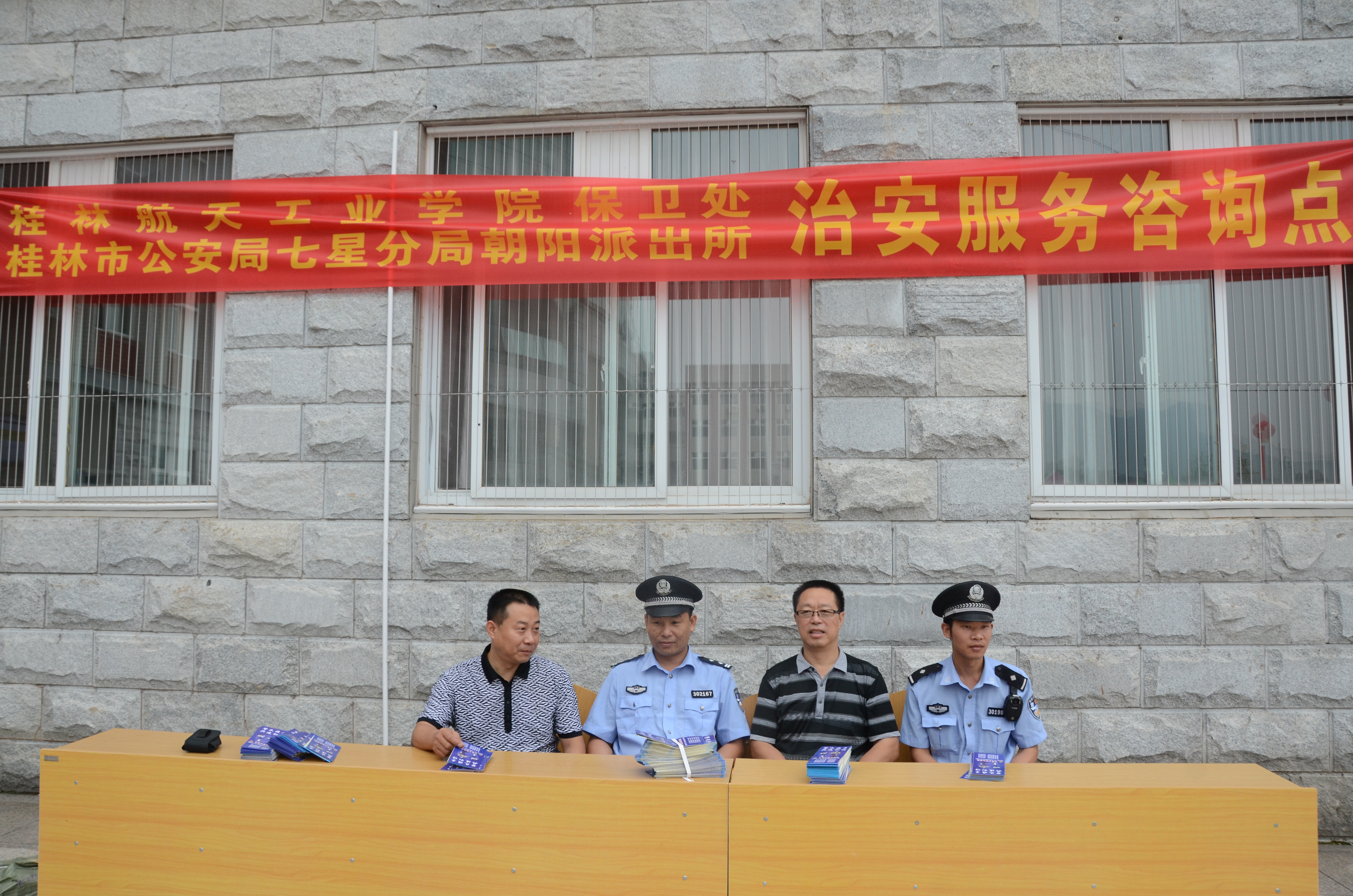 为确保迎新期间校园秩序井然,在新学期开学前,保卫处诚邀七星区公安分局朝阳派出所所长和片区民警来我校就迎新期间的治安联防工作进行了座谈,对学校的安全环境实行群防群治和联合执法形成了共识。迎新期间,七星公安分局治安大队、七星交警大队全天候在校区及周边道路执勤,对我校南北校区路段进行交通秩序管制和疏导,桂林市城管支队领导带队、七星城管大队派员对校园周边一条街商贩占道经营、交通堵塞、饮食卫生等进行清理整治。同时,七星公安分局朝阳派出所也到我校与保卫处共同设立治安服务咨询点,对新生集中开展法制宣传和提供安全服务咨询,利用制作安全教育宣传展板、发放安全宣传手册等方式,有针对性地对新生进行了防盗、防诈骗、防侵害、防传销、防非法宗教和敌对势力的渗透、防恐怖袭击等安全教育和法律宣传,进一步提高学生的法制意识和防范能力。