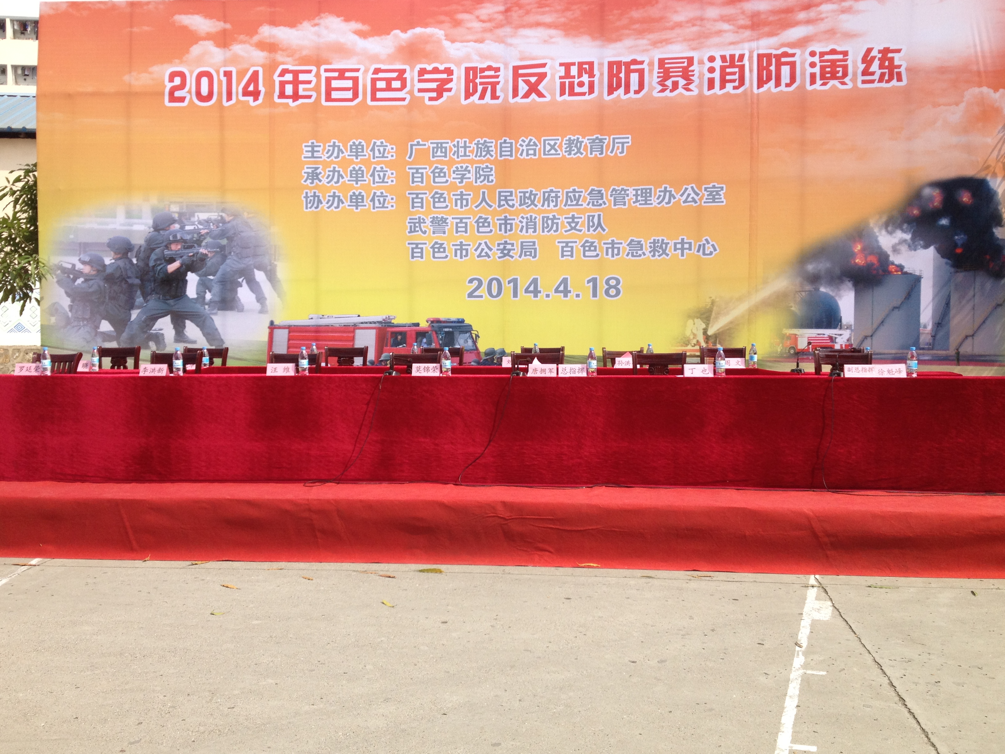 会后开展了2014年百色学院反恐防暴消防演练观摩活动。