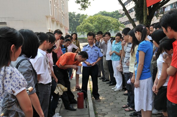 为增强师生消防安全意识,加强校园消防安全工作,5月20日下午,我校在9号公寓楼前小操场举行了2011年度第一次消防安全培训及灭火演练。此次演练共有27个部门135名教职员工代表参加。