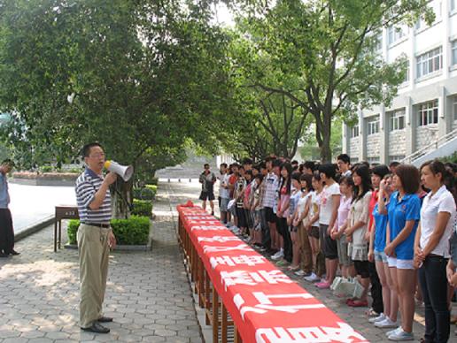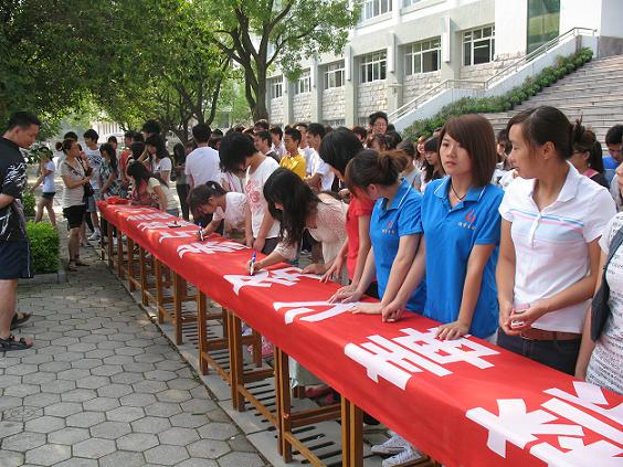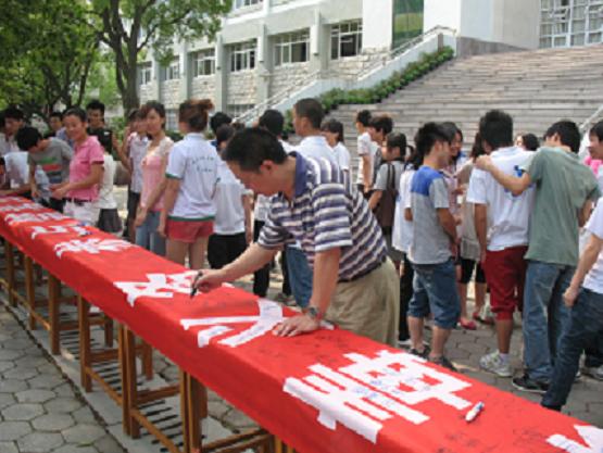 为使学生们进一步认识毒品的危害,抵制毒品。2011年“6•26”国际禁毒日,我校100名学生干部在青春广场举行了签名活动。