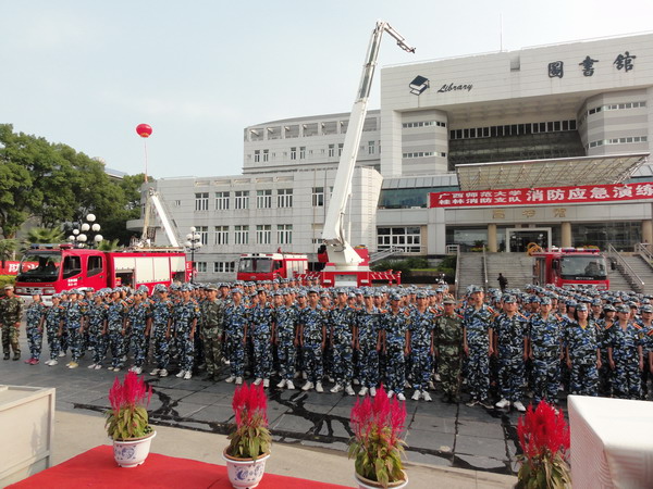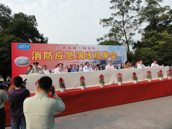 9月23日下午,由自治区教育厅主办,广西师范大学与桂林武警消防支队承办的2011年广西高校(桂北片)消防应急演练观摩会在广西师范大学举行。出席观摩会的领导有教育厅正厅级巡视员林宁、教育厅安稳处副处长周克依、桂林市副市长、公安局长黄济贤、桂林市公安局副局长刘小平、桂林消防支队副支队长黄维政、广西师范大学党委书记王枬及桂北片各高校分管消防安全工作的领导和保卫处长。我校保卫处处长刘武定代表学校参加了观摩会,参加观摩会的领导、嘉宾、演练人员及学习人员共3000余人。
