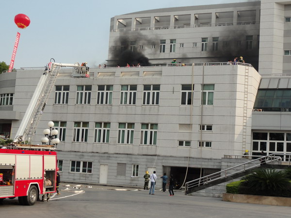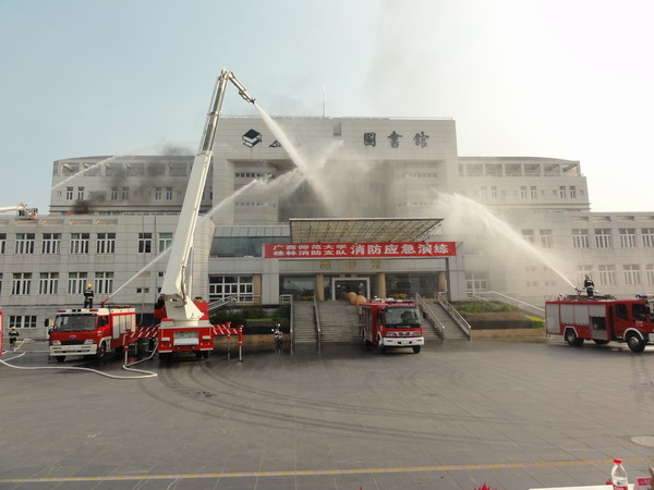 观摩会由广西师范大学王枬书记、桂林市黄济贤副市长先后做了重要讲话。演练正式开始后,图书馆三楼天台点燃火点。滚滚浓烟,使得被困学生拼命挥动着手臂向地面人员求救,图书馆工作人员确认火情后,迅速组织现场师生员工灭火,拉响消防警铃,同时向“119”报警。保卫处(通讯联络组)立即向学校领导(演练总指挥)报告,启动消防应急预案,义务消防队赶赴着火部位。灭火行动组迅速赶到火灾现场,先切断非消防用电、将电梯迫降到首层,查看防火卷帘、排烟风机和消防水泵,确保消防设施和消防用电正常。疏散指挥组控制各疏散通道出口,设置警戒区域,组织楼内师生疏散逃生,大楼内图书馆工作人员立即带领人员通过就近的消防通道有序地迅速逃离,疏散出的人群用毛巾(或衣服)捂住口鼻,身体贴近地面行走,按照疏散指引到图书馆左、右两侧空地集结。桂林消防支队接警后,立即出动各种消防车辆10辆,赶赴图书馆火灾现场展开灭火救援工作:启动云梯车解救被困人员;利用高压水枪扑灭火源;消防队员利用缓降器解救被困人员;利用救生气垫救援;利用多功能担架救人;消防举高车灭火。医护人员将伤员紧急处理后送往医院救治。