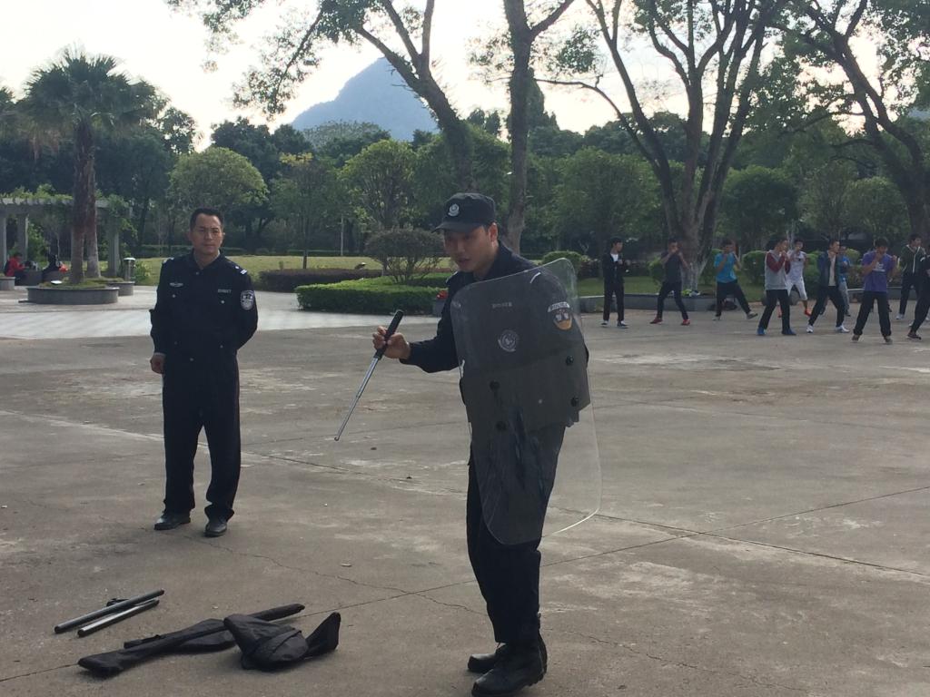 培训中,七星公安分局蒋警官主要针对校卫队员在平时执勤的过程中,面临偷盗、诈骗、不法分子进校寻衅滋事等情况,如何采取正确有效的应对措施以及在应对过程中应该着重注意哪些细节等方面进行了深入的讲解,并现场给参训人员讲解和示范了圆形盾牌、中型盾牌、U型叉、脚叉、甩棍、T型警棍等警用器械单独以及配合使用的方法。