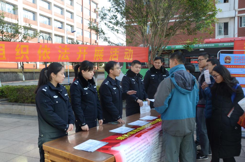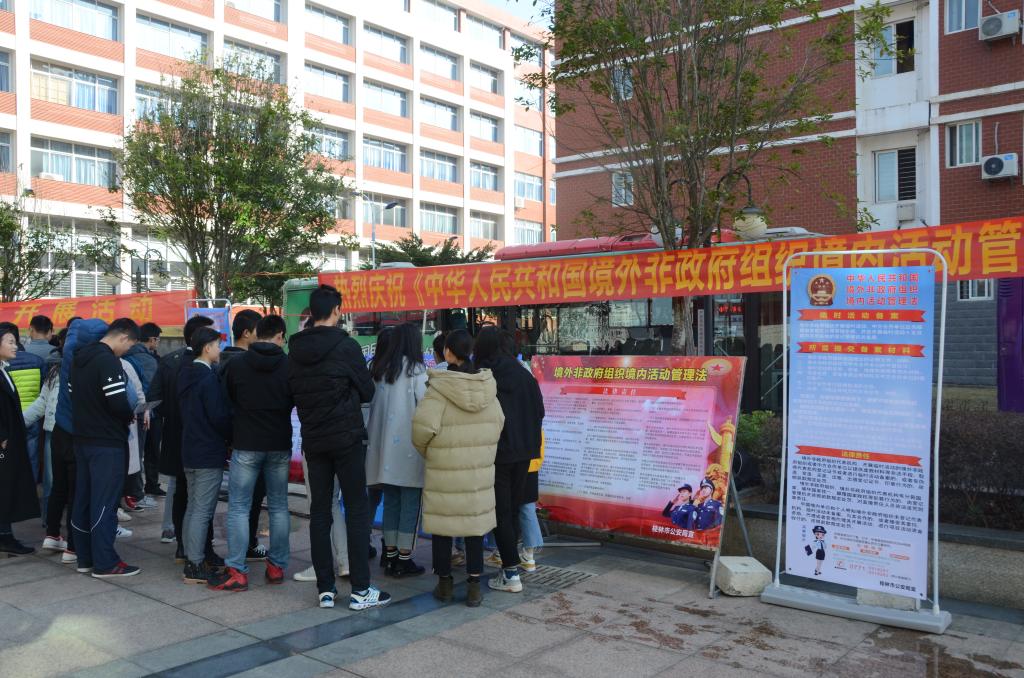 1月11日上午,桂林市公安局国保支队副队长胡世军、公安局法制支队副队长黄建平率队到我校开展《中华人民共和国境外非政府组织境内活动管理法》(以下简称“《管理法》”)实施一周年现场普法宣传活动。