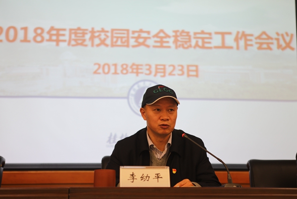 党委书记李幼平在主旨发言中强调,要深入学习习近平总书记新时代关于安全工作系列重要讲话精神,按照2018年全国学校安全工作视频会议工作要求,抓重点、补短板、强弱项开展工作。要提高政治站位,始终把政治安全挺在所有安全工作的前面。要完善安全防范的各项制度,以制度和机制来确保校园安全。要消防安全抓日常,交通安全抓秩序,食品安全抓责任,实验室安全抓规范,活动安全抓预案,各部门、各责任人各司其职,共同打造“平安校园”,为学校的迎评工作和快速发展营造持续安全稳定的环境。