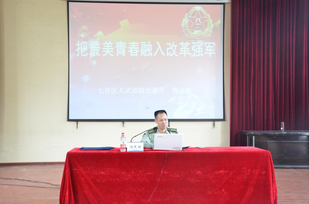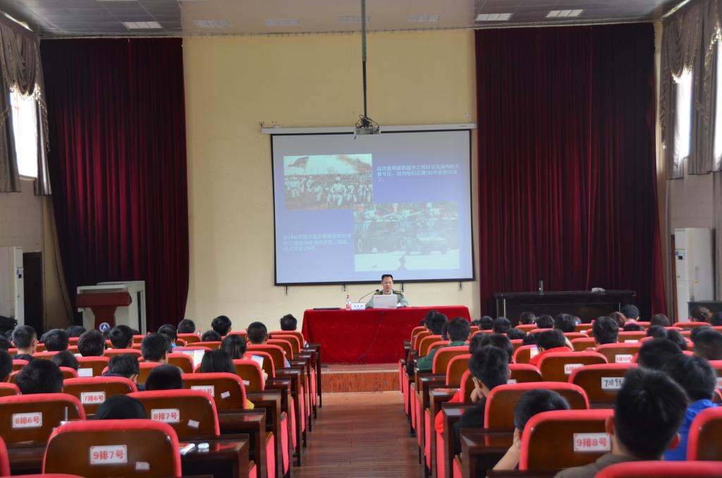 4月24日下午,桂林市七星区人民武装部政委周足根上校一行3人到我校开展征兵宣传讲座,讲座在北校区电教馆举行。学校武装部副部长卫涛、各学院辅导员及学生代表200余人到场聆听讲座。