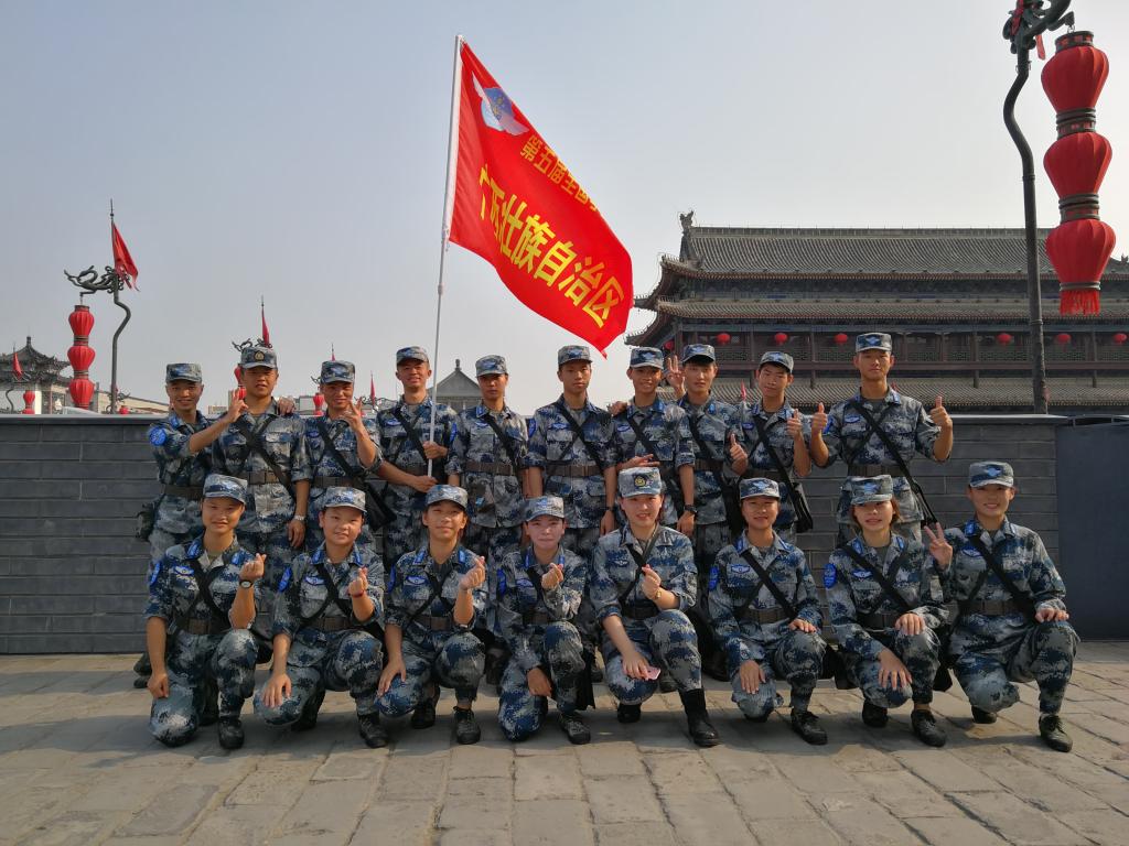 暑假期间,由广西医科大学、桂林航天工业学院、柳州市第三中学、桂林市逸仙中学16名大、中学生组成的广西区代表队,与来自全国其他30个省(自治区、直辖市)和新疆生产建设兵团的496名青年学子齐聚位于古城西安的空军工程大学,参加了由教育部、中央军委国防动员部联合主办,空军首次承办的以“我爱祖国的蓝天”为主题的第五届全国学生军事训练营。这是我校首次参加全国学生军事训练营活动。