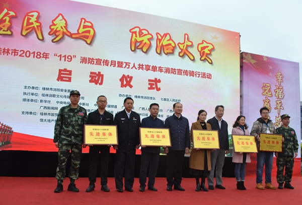 启动仪式上,与会领导首先为热心消防公益事业、积极投身社区消防宣传工作的先进个人和集体进行了颁奖。随后,陈荣茂副市长就桂林市“119”消防主题宣传月启动仪式进行讲话,并宣布共享单车消防宣传骑行活动正式启动。