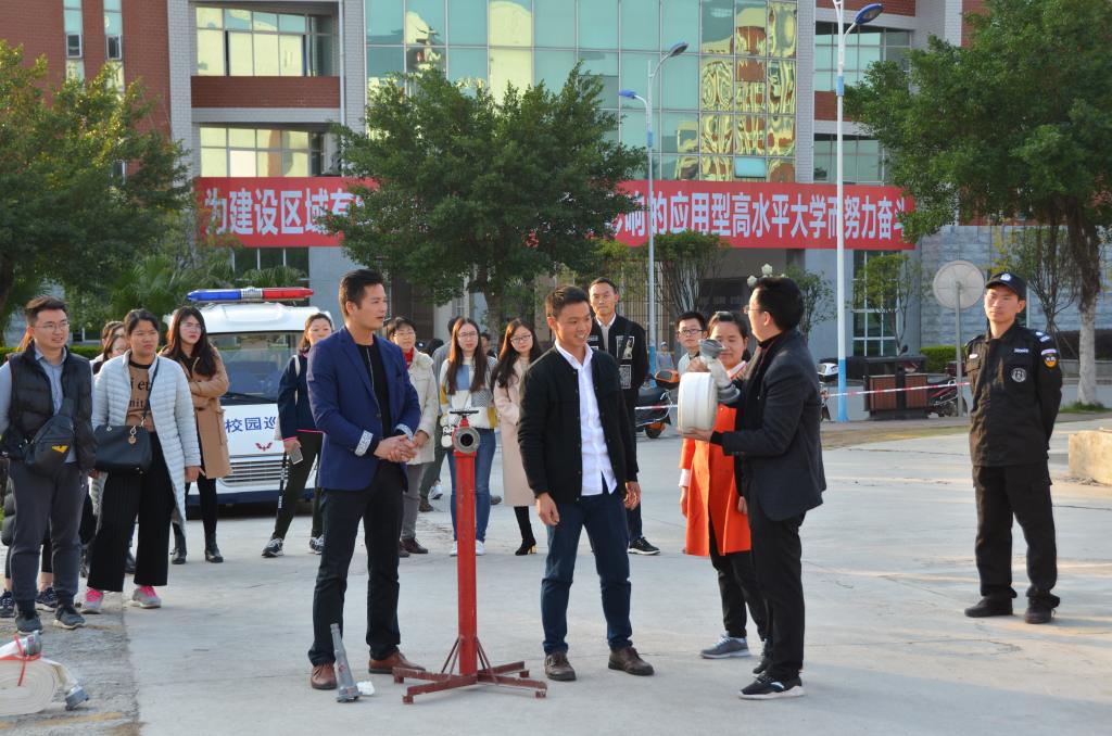 演练活动中, 罗开吉以桂林最近发生的火灾引入,强调了火灾发生所带来的巨大损失和惨痛教训,分析了火灾的类别及发生因素,提出了防范措施及处理方法,并向参训人员具体讲解了干粉灭火器、室内消火栓的实际操作方法,保卫处校卫队员配合讲解进行了消防器材的实际操作演示。随后,参训人员分组体验了现场使用干粉灭火器灭火,消火栓、消防水带、消防水枪的驳接练习。