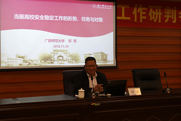 为确保全区高校持续安全稳定,营造良好的社会环境。11月29日,全区高校安全稳定工作研判会在我校举行,深入分析研讨高校现存的安全隐患及预防解决工作方案。我校党委书记李幼平、副校长郝德温、自治区教育厅安稳处负责人周献兴出席会议,来自广西大学、广西师范大学、桂林电子科技大学等区内70余所高校保卫处的80余名代表参会。