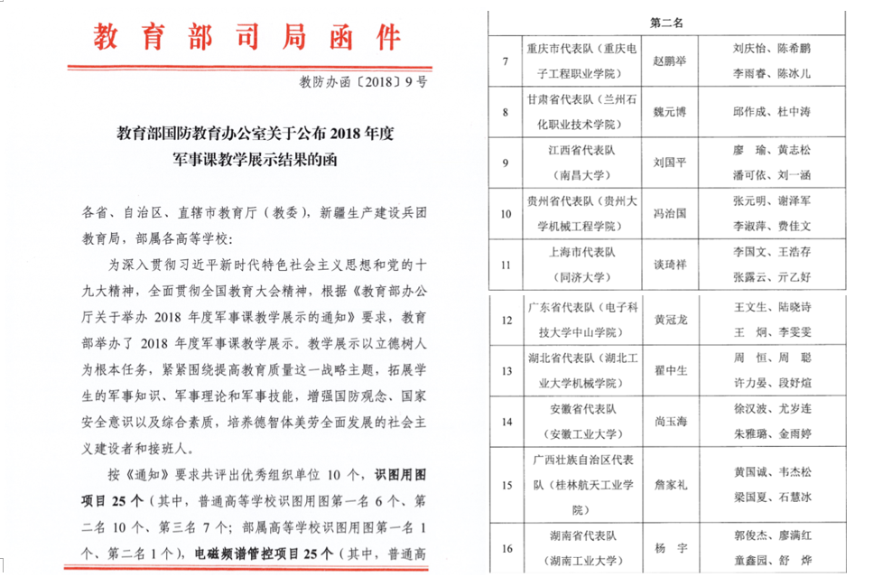 近日,教育部国防教育办公室正式公布了2018年度军事课教学展示获奖名单,我校学子在参加的2018年度军事课教学展示项目中表现优异,获得普通高等学校机器人项目第二名的好成绩。