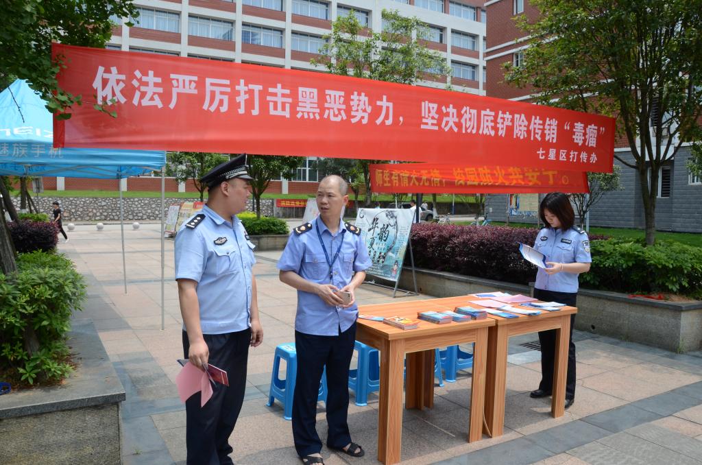 5月24日上午,桂林市七星区公安分局、桂林市政法委、桂林市市场监督管理局联合到我校开展消防安全知识宣传、扫黑除恶法制宣传以及打击传销“毒瘤”活动。