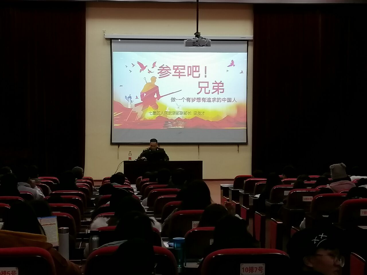 七星区人民武部梁友才副部长结合国内外形势,以“参军吧,兄弟”为主题,引导大学生要立报国志、树强军梦,积极献身国防,并对今年大学生应征入伍后,国家提供的学费补偿、家庭优抚、立功奖励等多项优惠政策进行了介绍,使同学们对国防知识和征兵政策有了更全面的了解。他指出,火热的军营是砥砺人生的奉献舞台、深受尊重的职业舞台、立志成才的亮剑舞台,希望大家能够积极响应祖国号召,坚定理想信念,把青春奉献给祖国,把智慧奉献给军营,勇担强国使命,用汗水搏击青春,以实干造就伟业。