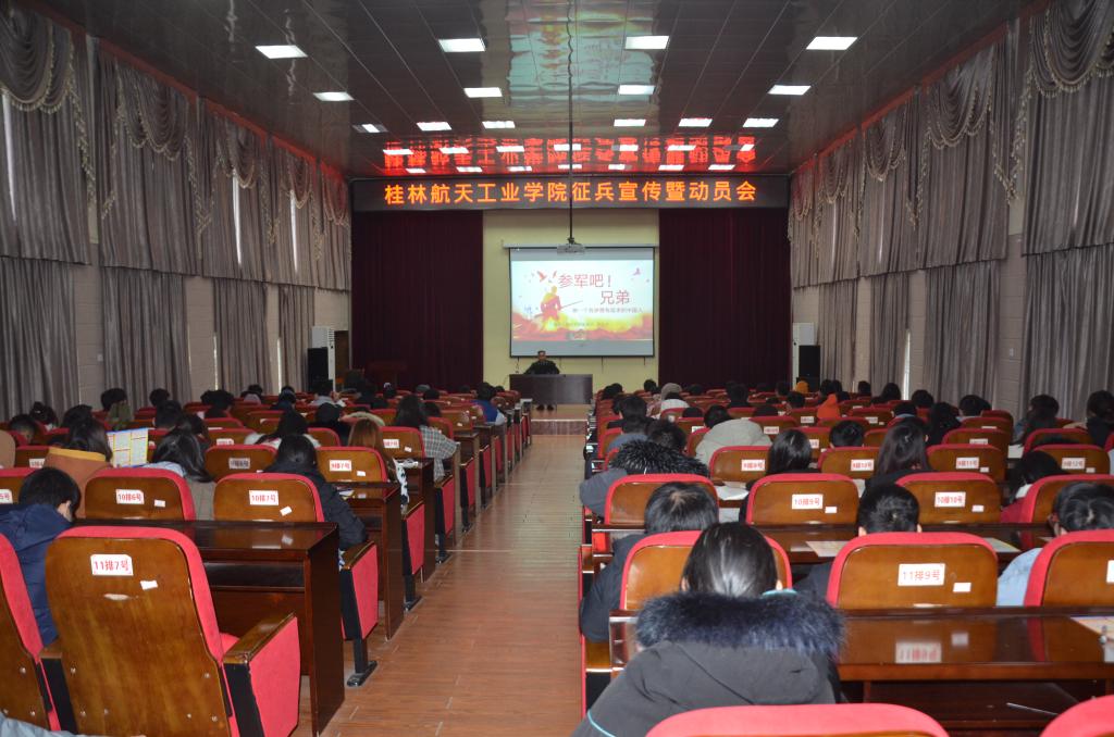 为进一步贯彻落实教育部办公厅《进一步做好高校学生参军入伍工作的通知》(教学厅[2015]3号)文件精神,扎实推进我校大学生应征入伍工作,强化政策解读,为大学生尤其是毕业生报名参军、投身强军伟业创造良好条件。12月17日下午,我校邀请桂林市七星区人民武装部梁友才中校等一行三人在我校北校区电教馆召开2021年征兵宣讲暨征兵工作推进会。学校武装部负责人及学生代表200余人到场参加会议。会议由我校武装部阳艳贵老师主持。