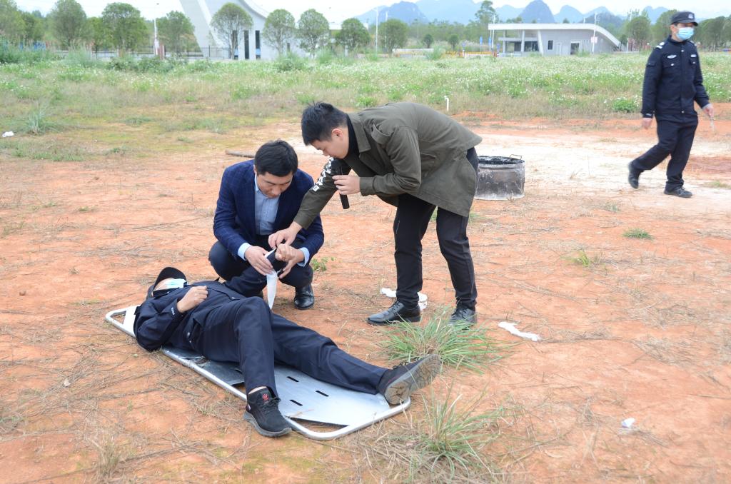 广西消防安全中心讲师农二凡向参训人员讲解火灾现场受伤简易急救法、火灾的扑灭方式以及水基灭火器和干粉灭火器的实际操作方法,保卫处校卫队员配合讲解进行了消防器材的实际操作演示。随后,参训人员严格按照“一摇、二拔、三压”的操作要领,分组体验了使用干粉灭火器现场灭火。