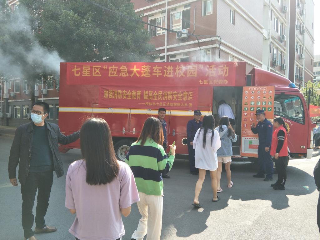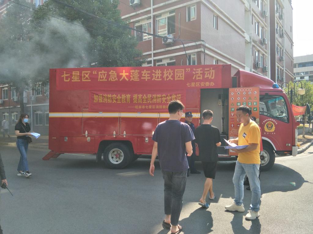 11月9日上午,七星区消防安全“应急大篷车”开入我校校园,由桂林市七星区农村农业局、七星区应急管理局、七星区消防救援大队与学校保卫处联合开展119消防安全教育宣传活动。