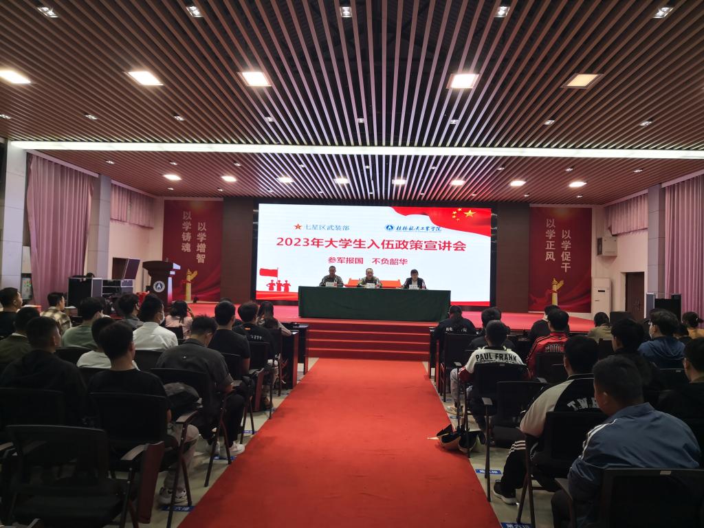为扎实推进我校大学生应征入伍工作,强化政策解读, 5月10日下午,我校邀请桂林市七星区人武部负责人及相关人员在我校北校区招聘大厅召开2023年大学生入伍政策宣讲会。学校有意向参军入伍的学生代表及各学院毕业班辅导员代表100余人到场参加宣讲会。宣讲会由我校武装部负责人主持。
