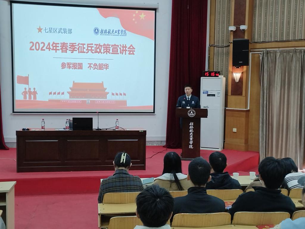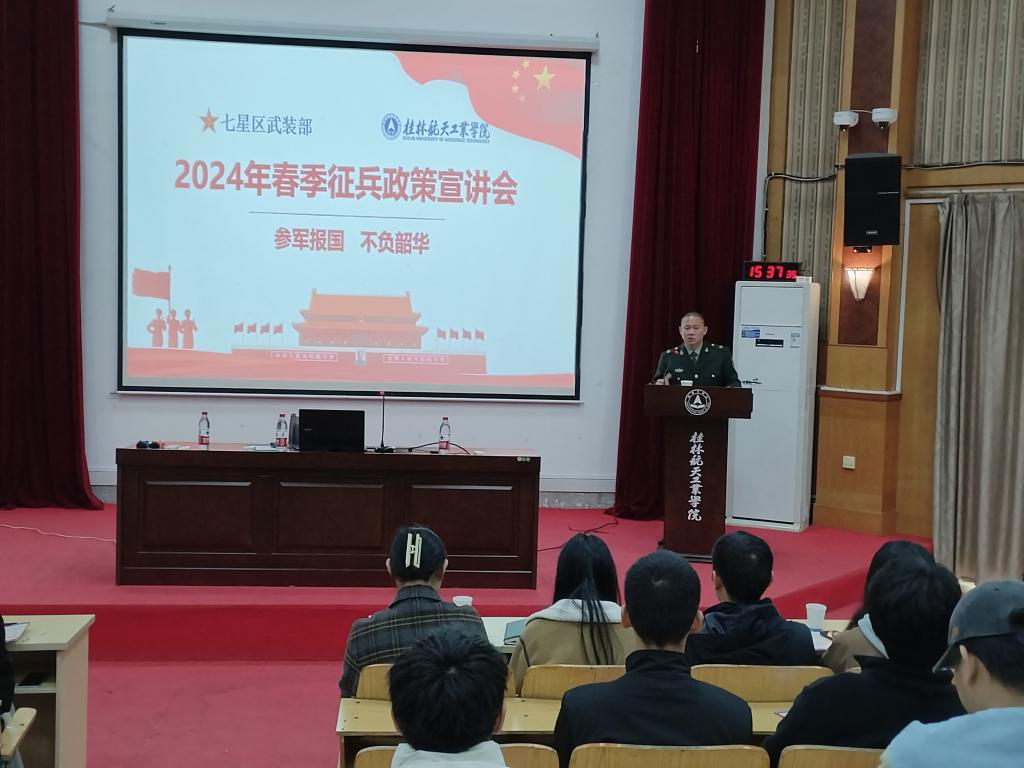 为扎实推进我校大学生应征入伍工作, 12月15日下午,学校邀请桂林市七星区人民武装部政工科阳京宏科长、王文华参谋一行2人到我校开展2024年春季征兵政策宣讲会,宣讲会在北校区致远楼108教室举行。学校武装部负责人、各学院毕业班辅导员及有意向入伍的毕业班学生代表100余人到场聆听宣讲会。