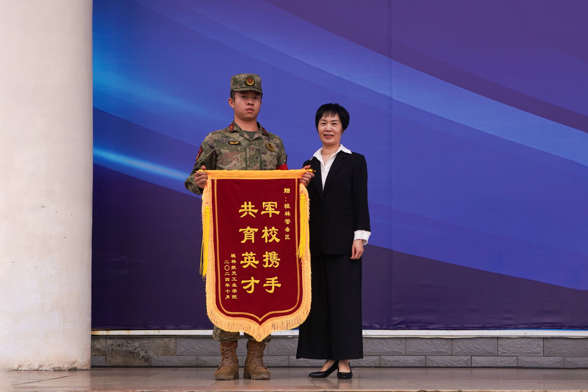 为感谢承训单位对我校军训工作的大力支持,吴江萍副书记代表学校向承训单位桂林警备区赠送了“军校携手 共育英才”的锦旗。